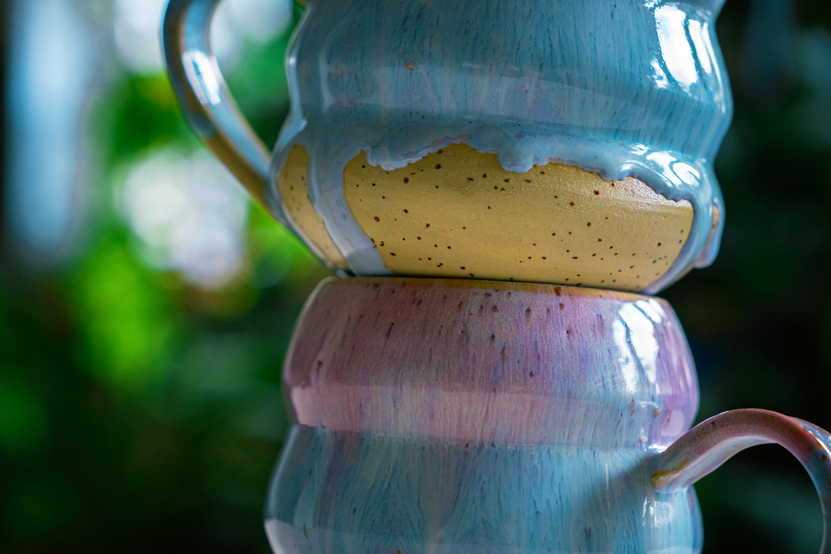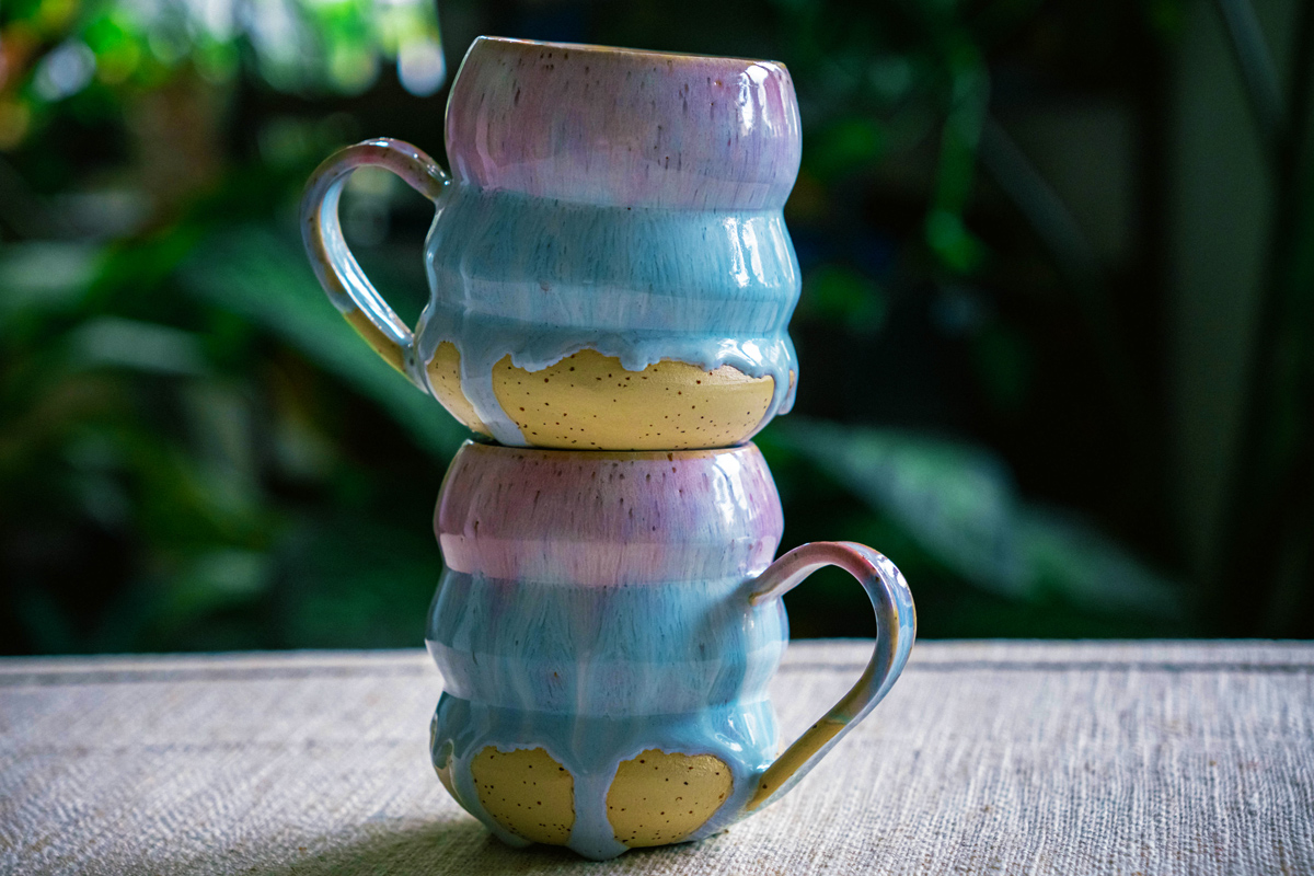 Diese Tassen sind wie ein Sonnenuntergang in Keramik: sanfte Übergänge von Rosa zu Himmelblau, fließende Glasur auf sandfarbenem Ton – jedes Stück ein kleines Farbspiel, das nie gleich ist und doch immer harmoniert.