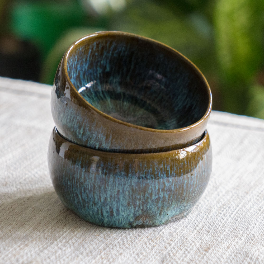 Diese handgefertigten Schalen verbinden dunkles, waldgrünes Blau mit einem warmen Braunton zu einem Glasurspiel, das an Moos, Erde und tiefe Wälder erinnert. Die glänzende Oberfläche bringt die natürlichen Farbverläufe besonders schön zur Geltung und macht jede Schale zu einem echten Unikat.