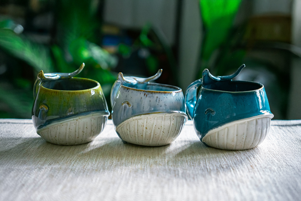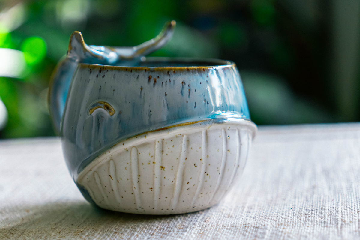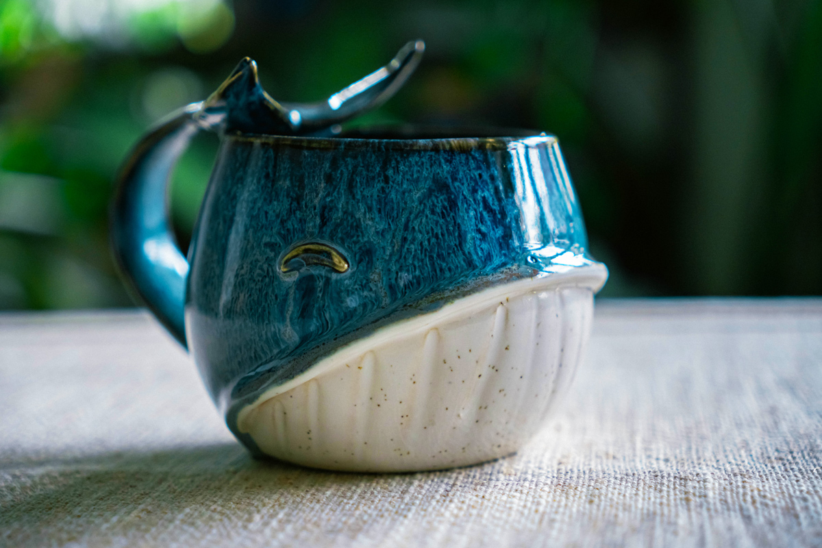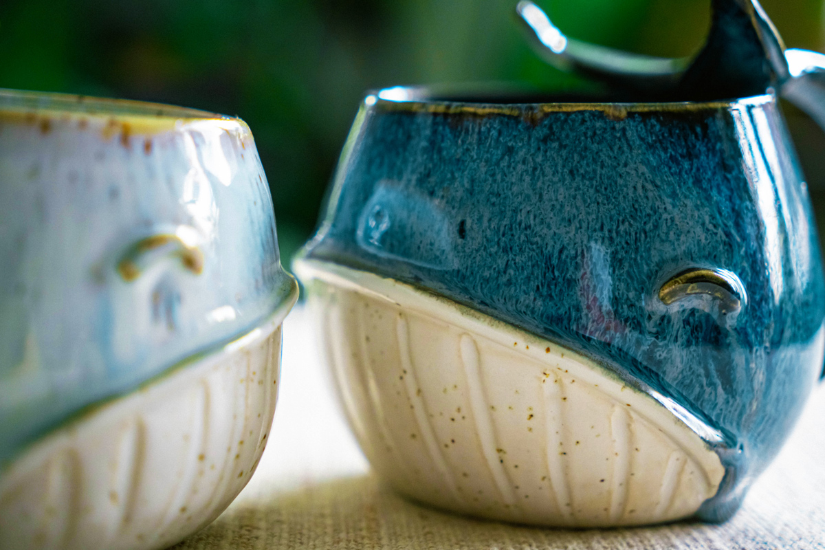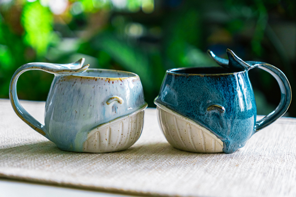 Diese handgefertigten Tassen zaubern nicht nur ein Lächeln ins Gesicht, sondern holen auch ein kleines Stück Ozean in deinen Alltag. Mit liebevoll modellierter Schwanzflosse als Henkel und sanft geschwungenem Walbauch liegen sie perfekt in der Hand – fast, als würden sie durchs Wasser gleiten.