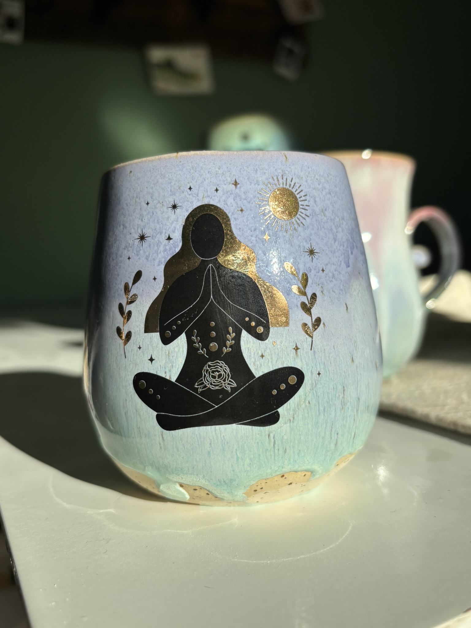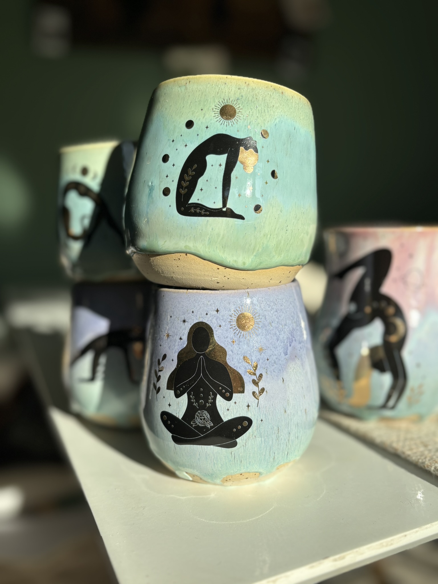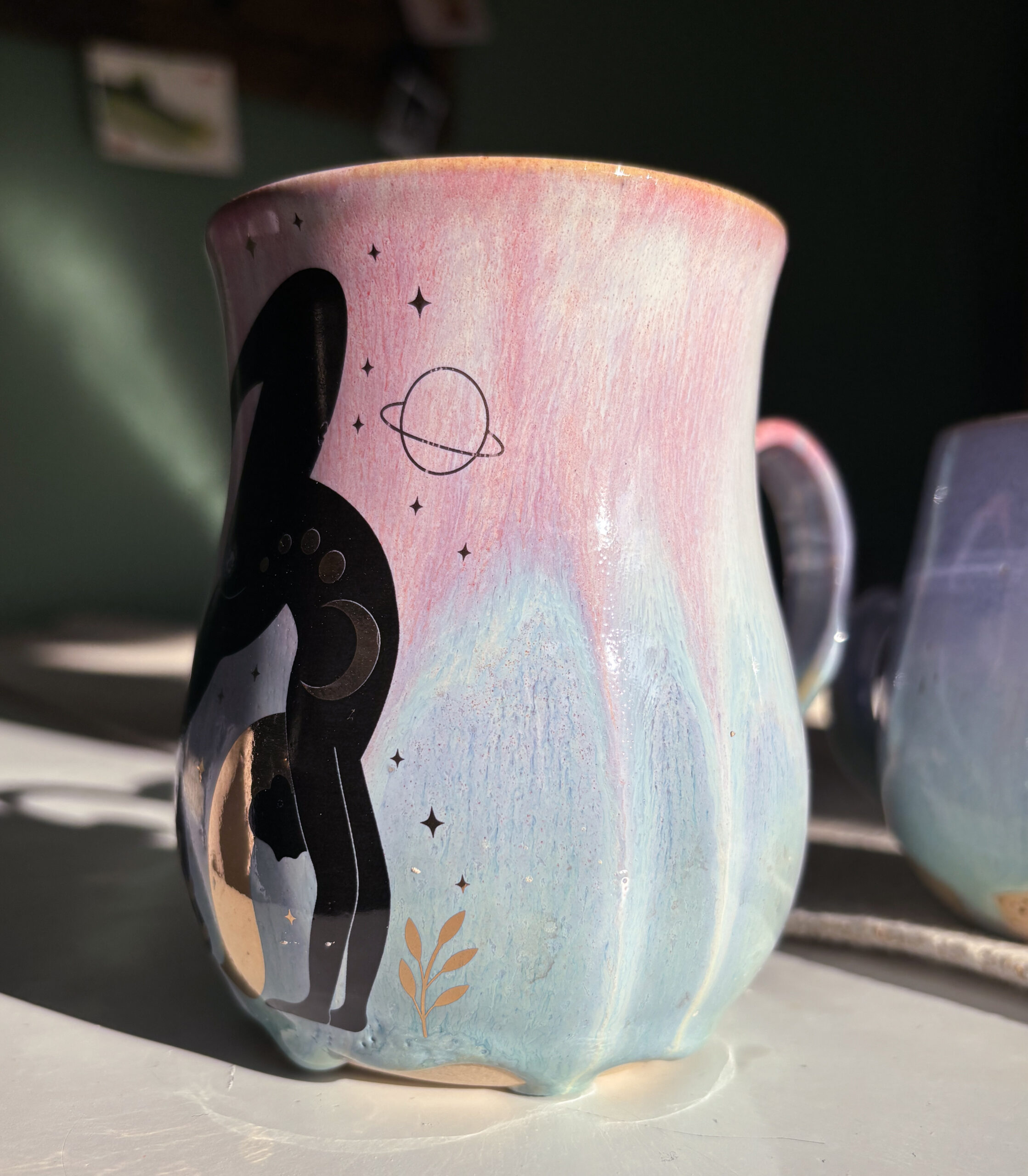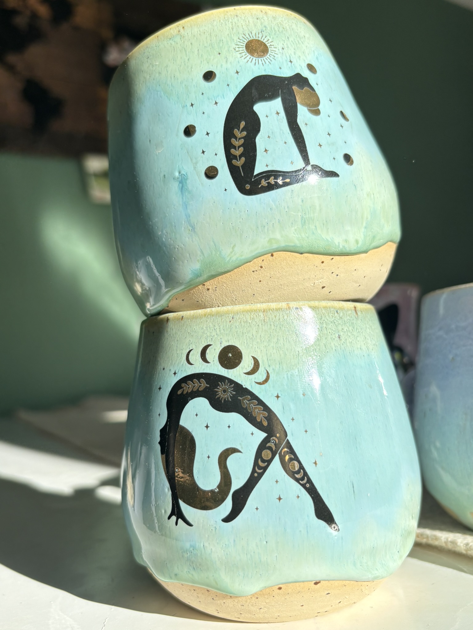 Diese handgefertigten Becher vereinen sanfte Farben mit starker Symbolik: Die zart türkisgrüne Glasur erinnert an Wasser, Himmel und Licht – und bildet die Bühne für detailreiche Illustrationen weiblicher Figuren im Einklang mit Sonne, Mond und Sternen.